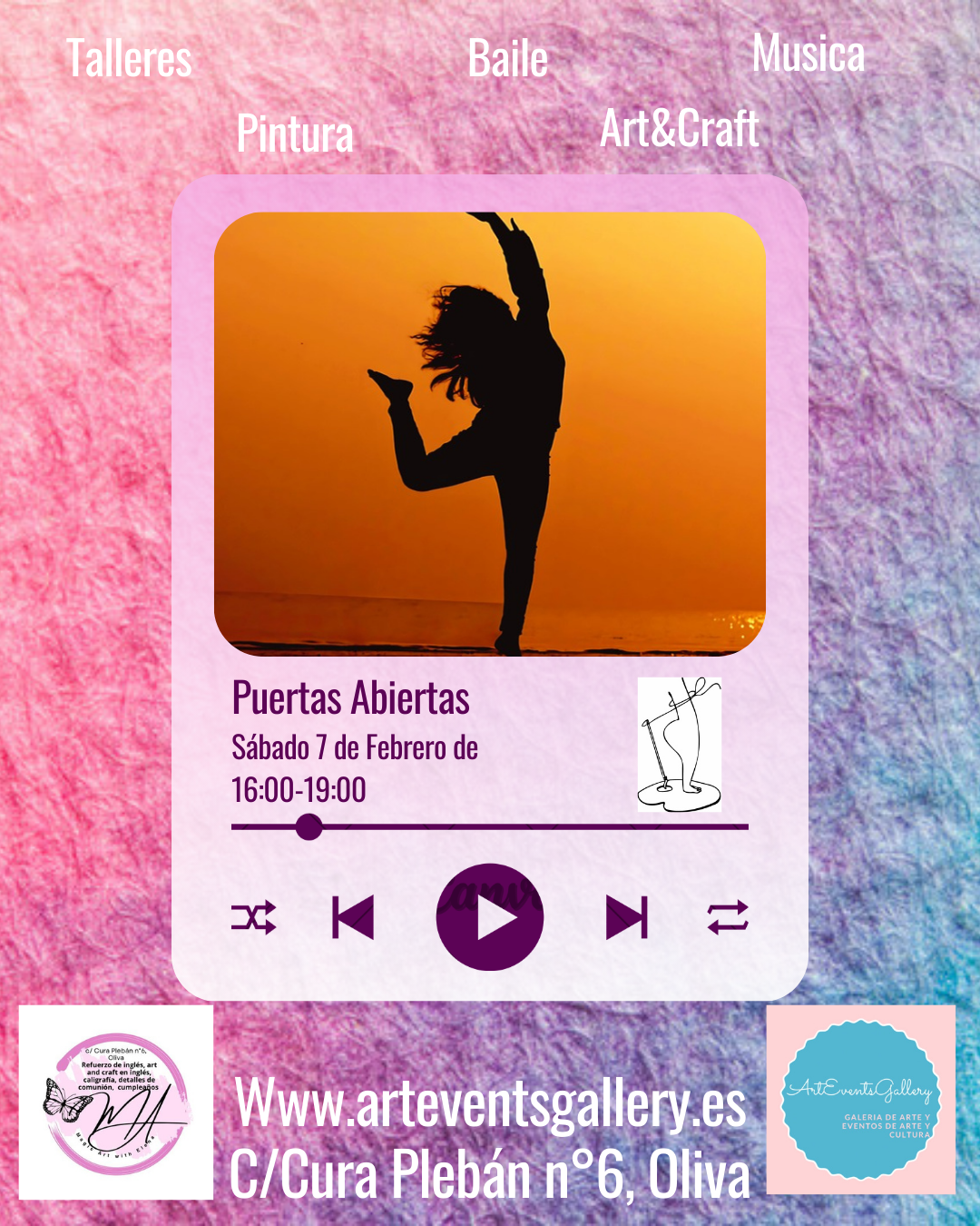 El próximo dia 7 de Febrero de 16:00-19:00. Jornada de puertas abiertas para conocer a nuestra nueva colaboración Cristina. Bailarina y artista. Realizaremos talleres de pintura, baile, art&craft, ceramica. Para todos los públicos. Mientras los papis vienen a bailar los peques pueden pintar, moldear y mucho más! Habrán snaks, musica y mucha diversión. C/Cura Plebán n°6, Oliva.